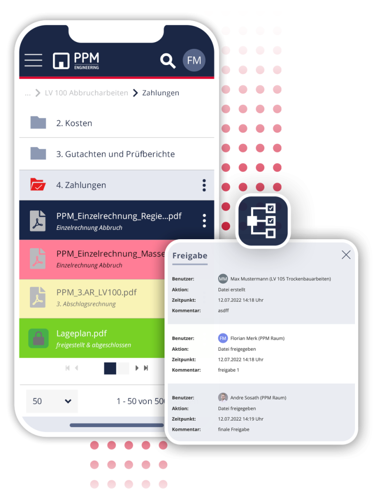 Individual, digital release processes for invoice, supplementary or plan releases can be integrated after coordination. Reduction of time and error rates through standardisation of processes. Uncomplicated integration of any number of external participants (e.g. experts) who are only involved in the project for a short time.