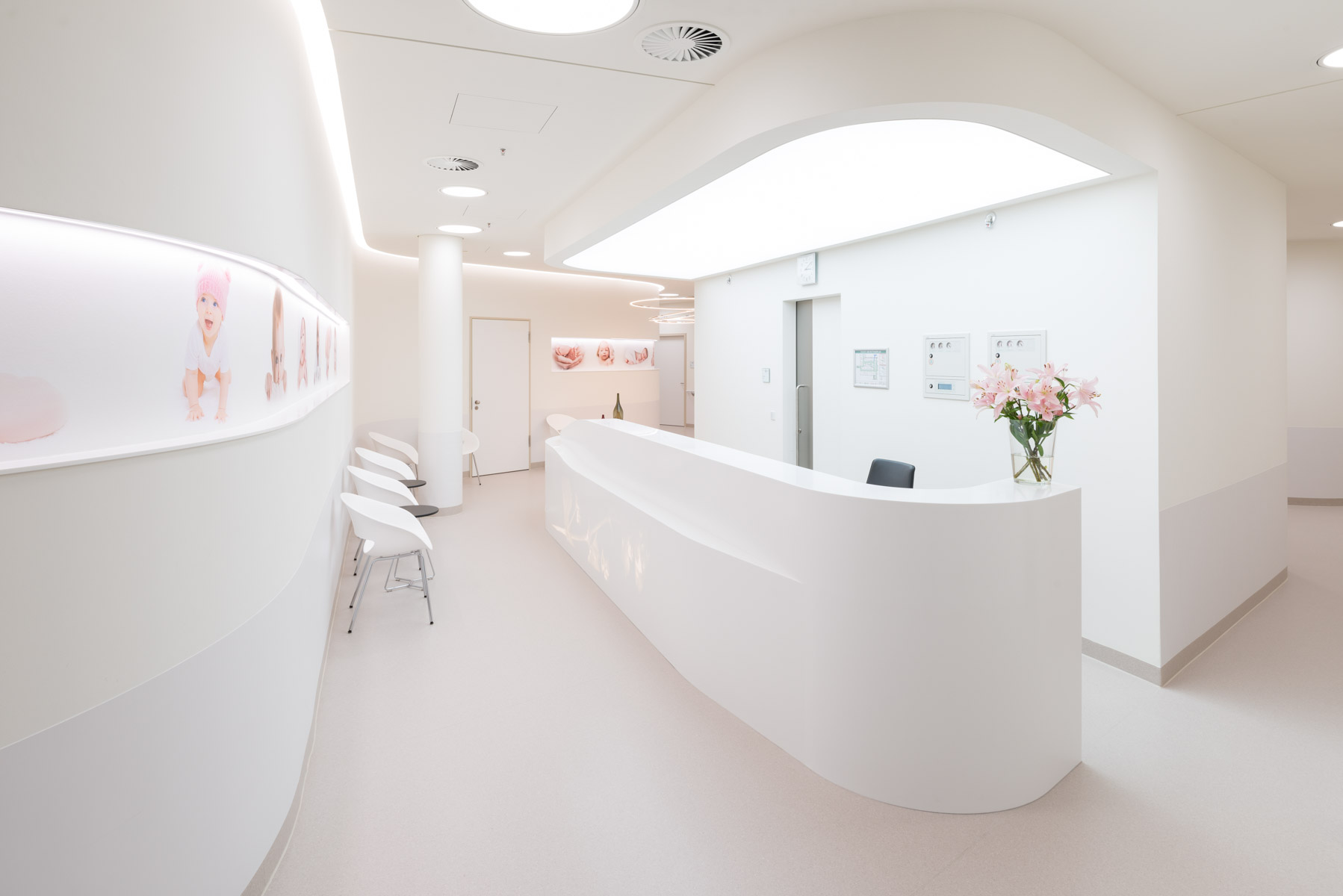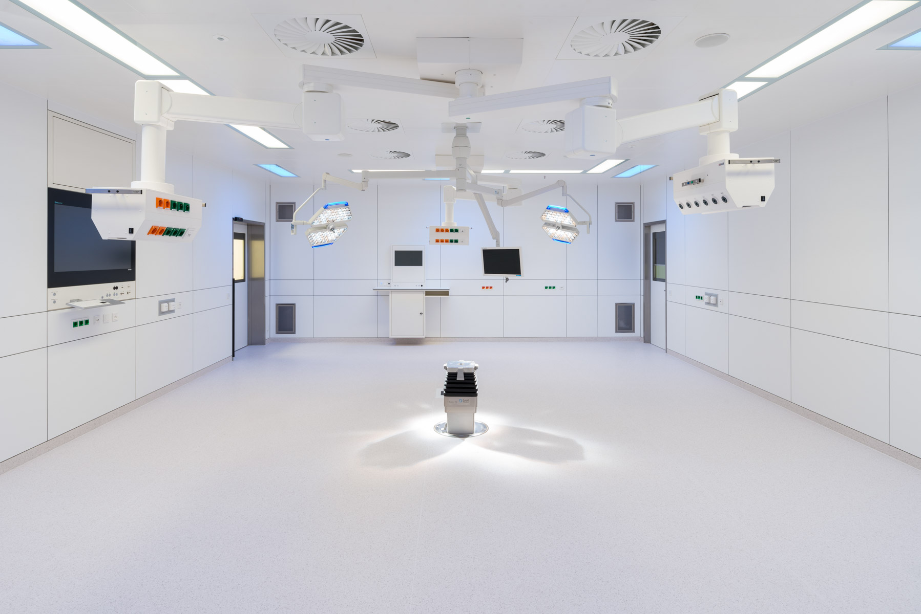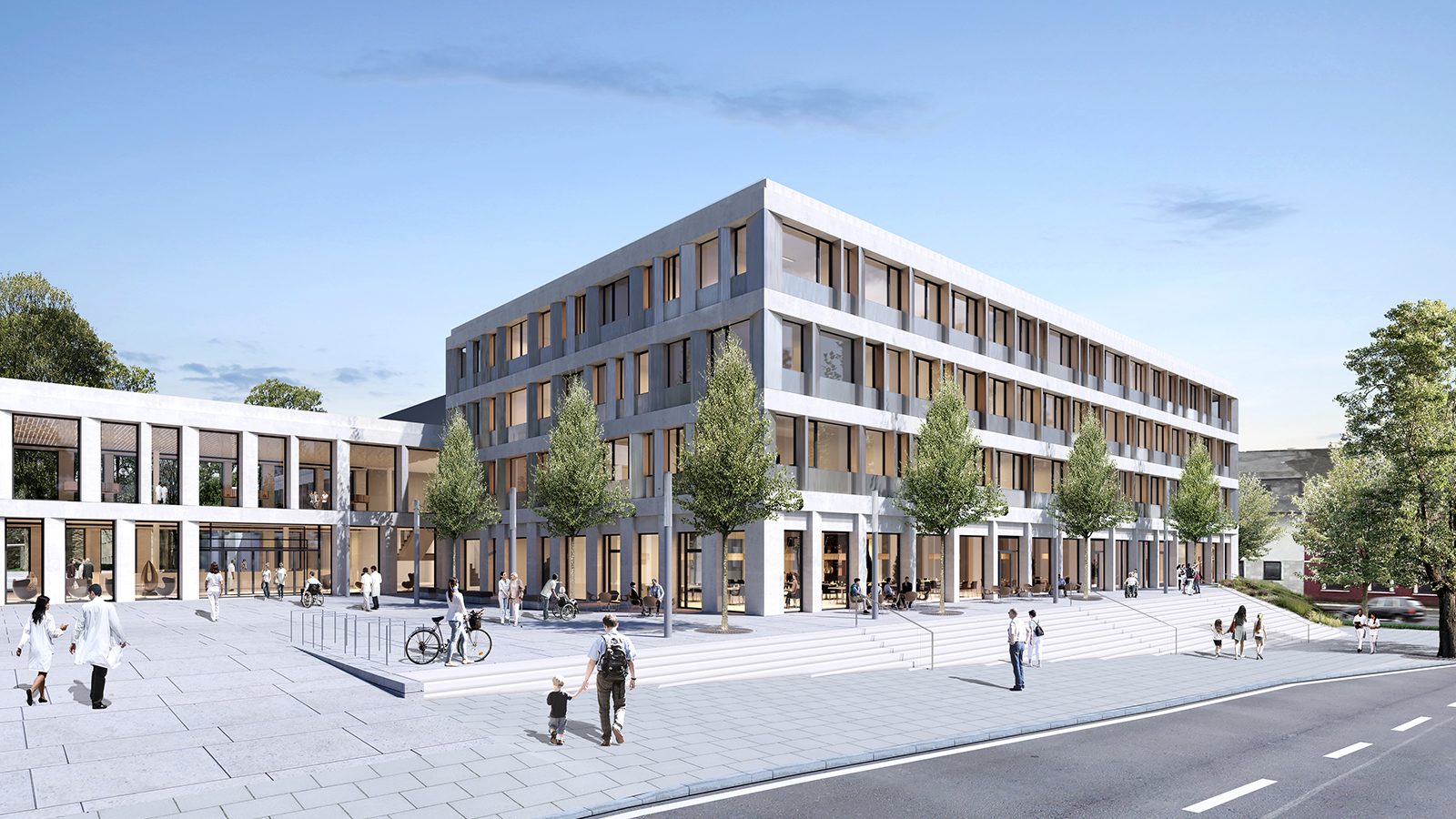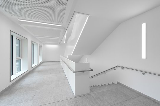 Ultra-modern examination and treatment areas are compactly combined in a two-storey functional building. Here, spread over two levels, are the central emergency room, the central elective admission, an intensive care unit, six operating theatres as well as endoscopy, radiology and other diagnostic facilities. The administration and the medical service are accommodated in a four-storey block that adjoins to the north. Slightly elevated on a plateau, it forms the new address building of the clinic. A surrounding, large outdoor staircase leads via the spacious entrance square to the main entrance and thus into the two-storey, daylight-flooded entrance hall. With the cafeteria as a public use on the basement floor, urban qualities are created on the entrance square.