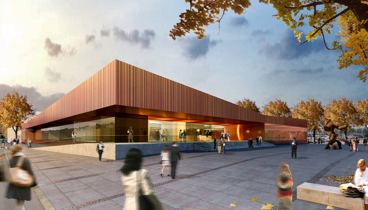 All surrounding building parts are connected to these two high points by means of polygonal folded roof surfaces, so that the result is a sculptural overall figure which presents the new Inselhalle as an architectural unit in the cityscape. Clearly defined cutbacks and indentations in the facade area illustrate the essential building orientations to the forecourt, the lakeside promenade and the Old School Square and at the same time accentuate the corresponding building entrances.