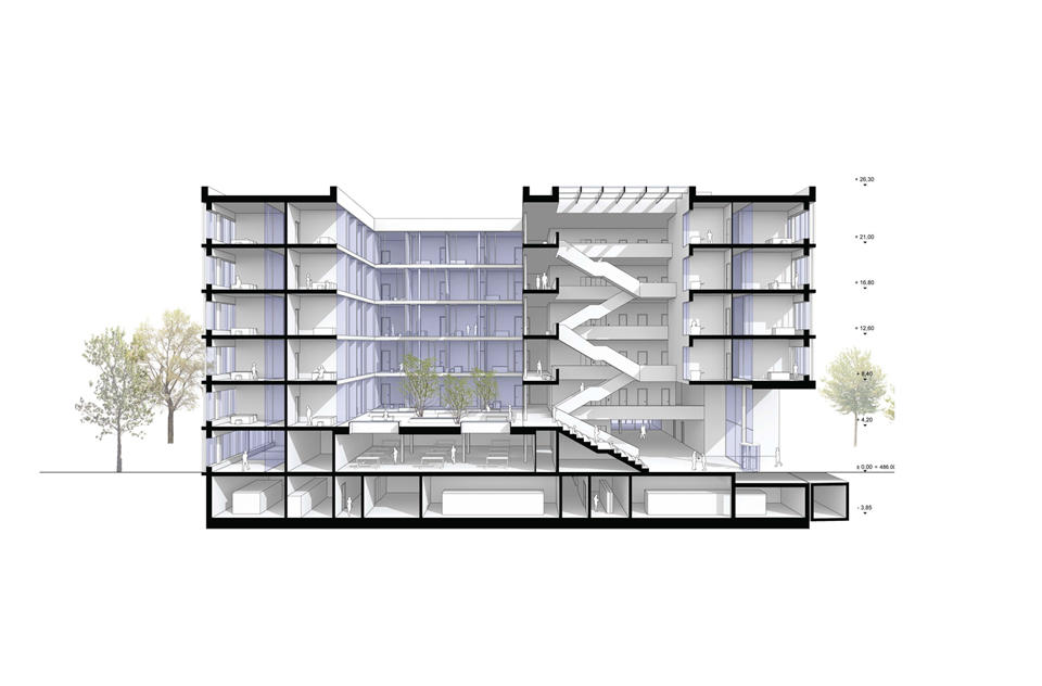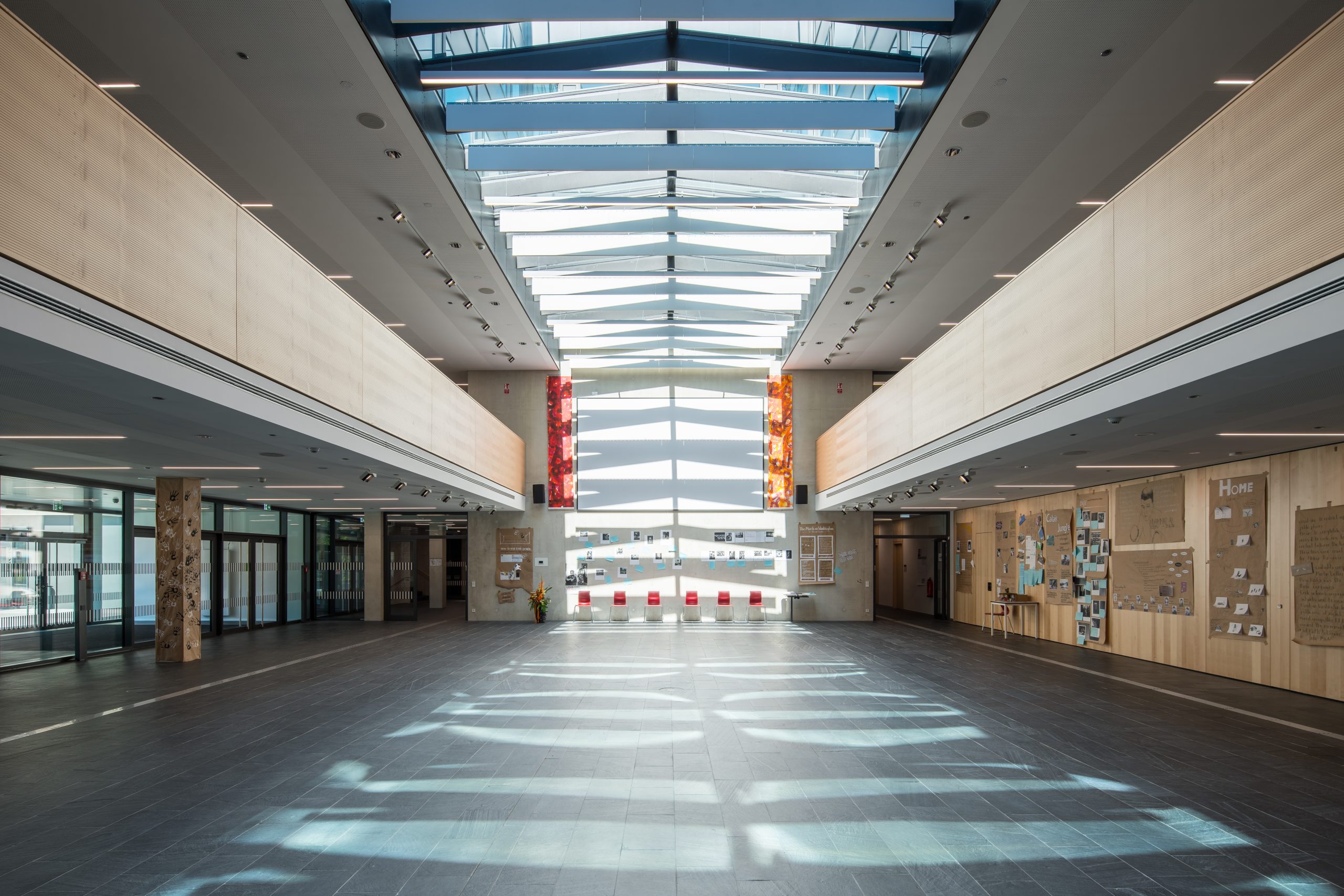 The school center basically consists of two elements: the two-story base with a sports hall, workshops, and central area, and the three-story theory wing. The school building is organized in a ring around an atrium, which serves as an air space for the central auditorium on the 1st floor. On floors 2 to 4, the atrium becomes an outdoor space (inner courtyard). This facilitates orientation in the building and creates a communicative atmosphere as well as visual relationships.