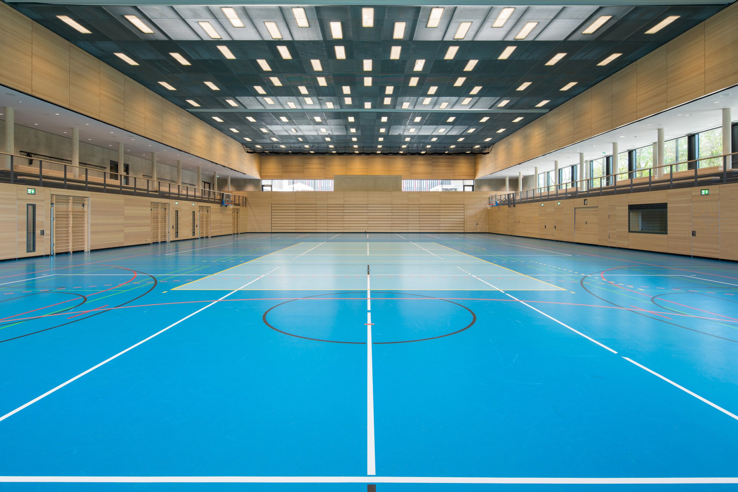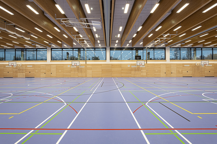 Thanks to the lowered playing field, the sports hall can be integrated into the two-story concept of the school complex. In accordance with competition use, spectators can reach the spectator stands on the two long sides at ground level. In combination with the foyer, the use of the hall as an event space for the school is supported.