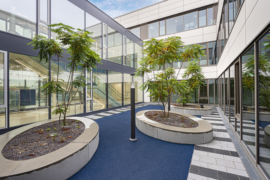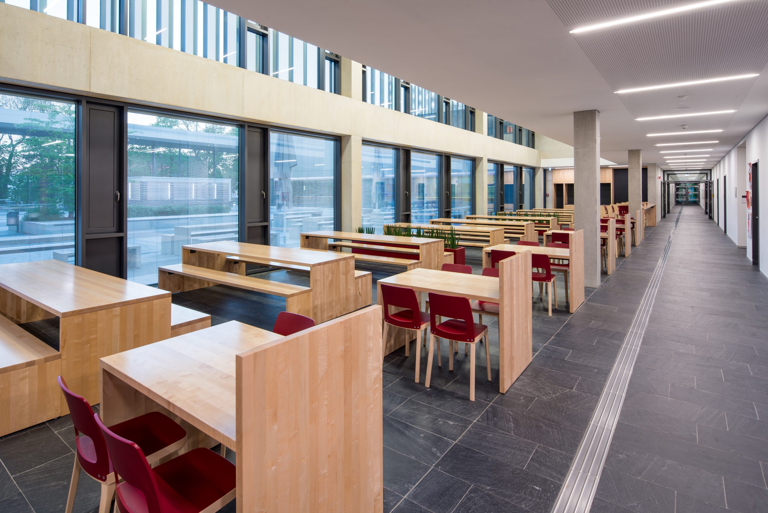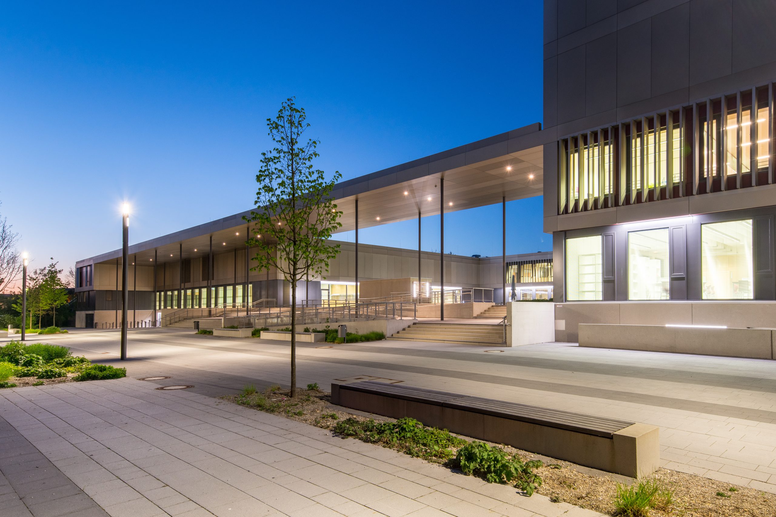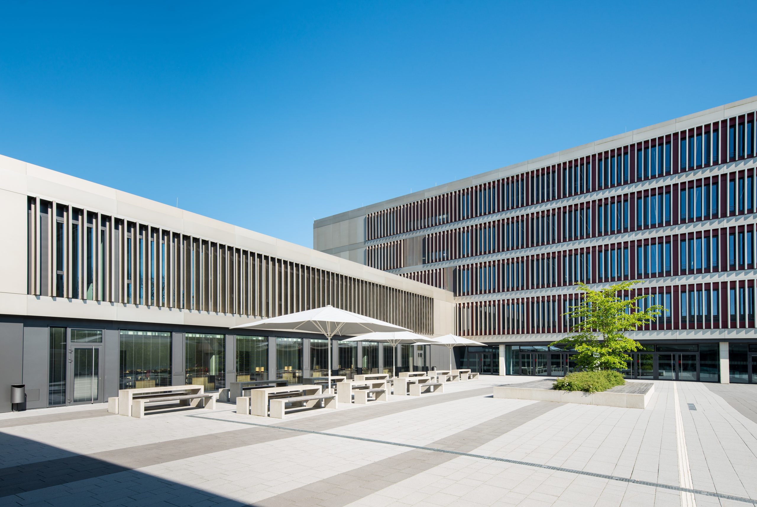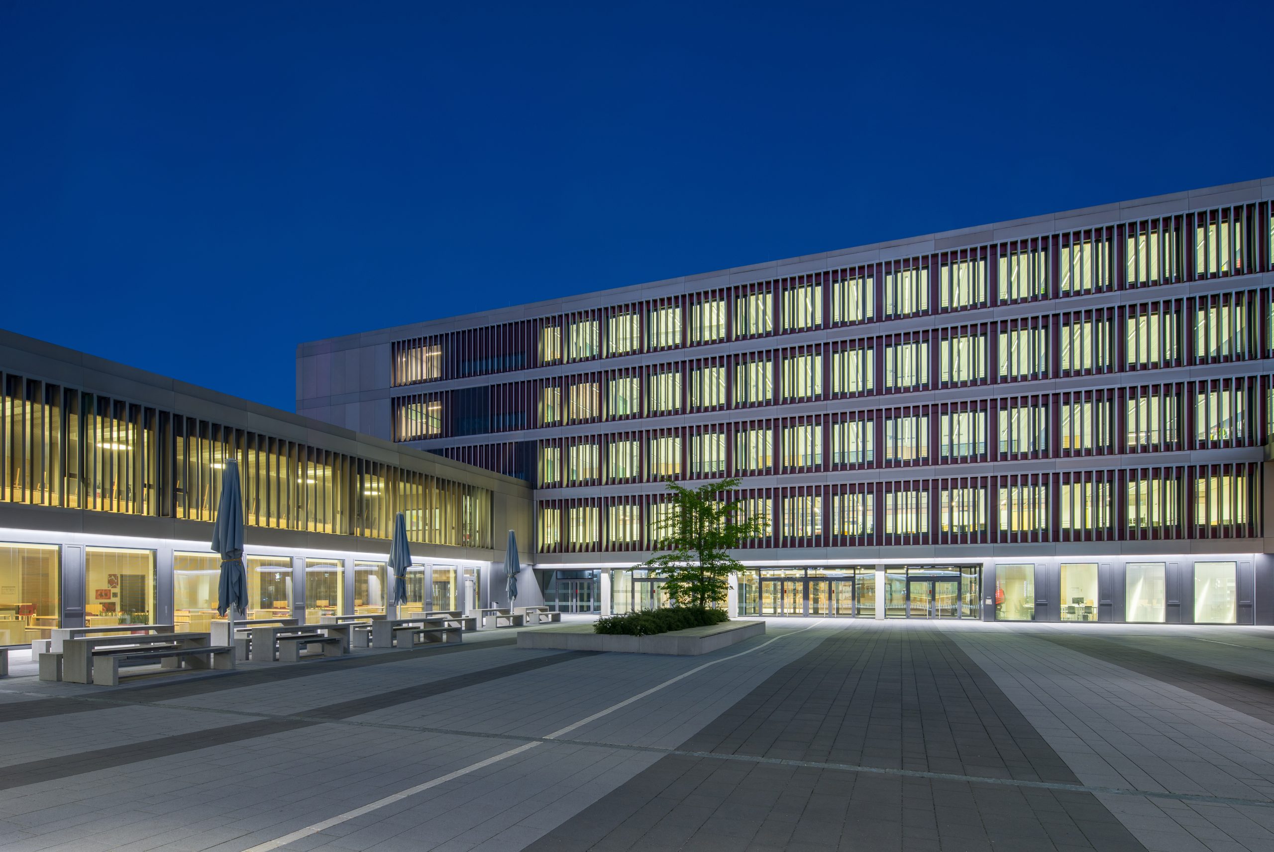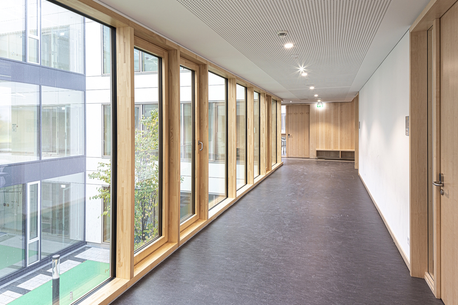 With a usable area of over 12,000 square meters, the Unterföhring school campus is the largest school construction project in the Munich district and one of the largest school buildings in Bavaria. The grammar school, a primary school, lunchtime supervision and cafeteria as well as a four-field sports hall and an underground car park were built on the 50,000 square meter site. The school campus, a 350 m long building ensemble, was designed as a so-called school boulevard in accordance with the external conditions of the site. Here, the primary school with lunchtime supervision, the after-school care center, the grammar school, the cafeteria, the sports hall and a central square were arranged. The school boulevard is a common development space, a connecting, identity-creating center of all facilities. The barrier-free architectural concept of the buildings corresponds to the pedagogical wishes for flexible rooms and learning areas with a high quality of stay. Generous and variable room structures in all school buildings enable traditional classrooms, but also learning houses for open learning.