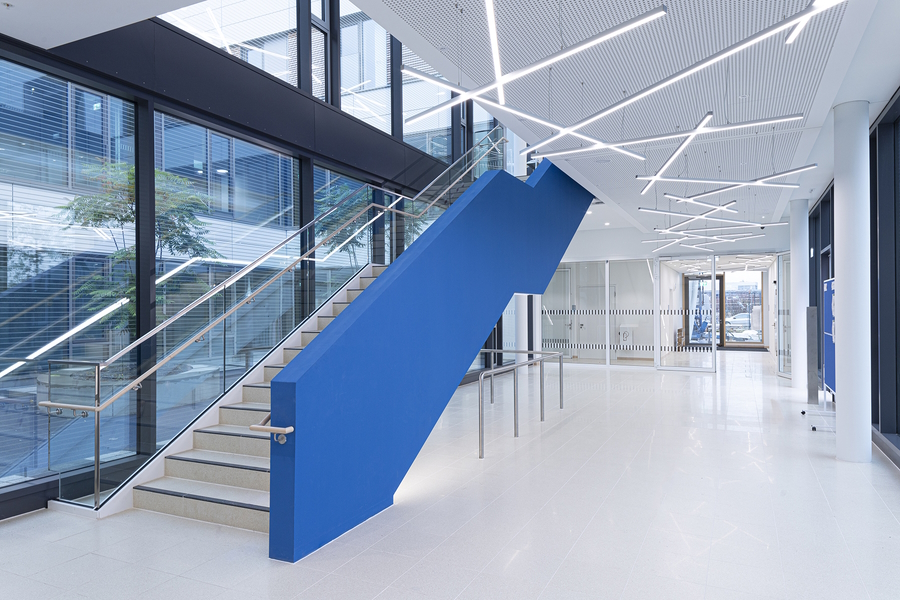 In the upper floors, two specialist clusters are combined with attractive, multi-purpose lounge areas. These zones offer views from the lounge areas and insights into the inner courtyard. The work islands are also assigned to the inner courtyard and are thus naturally lit. Administration, the teachers’ area, and central rooms are located in the base floor. The two-story workshop area is organized linearly.