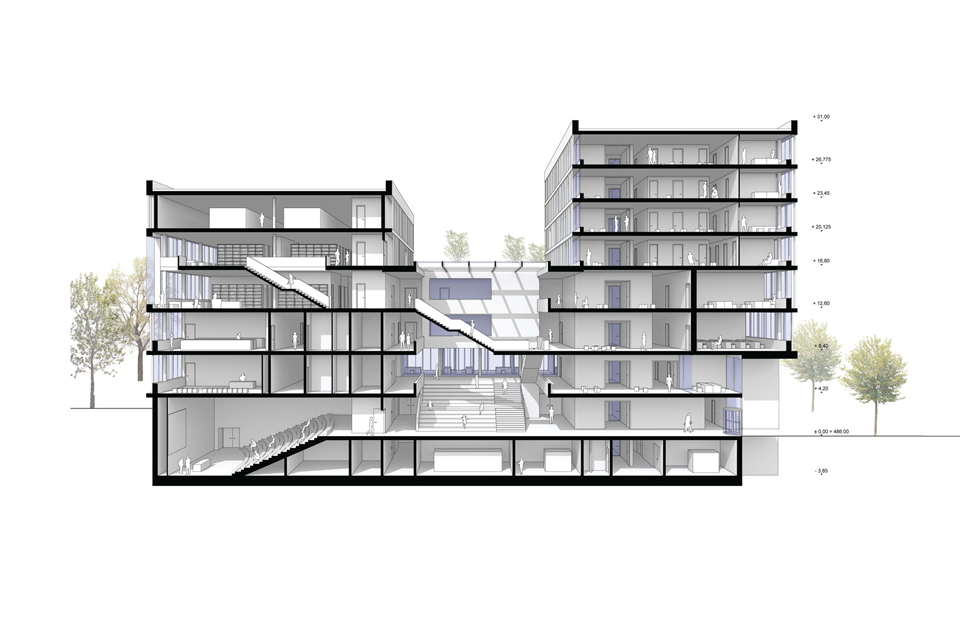 In addition to state-of-the-art lecture halls, the campus focuses on the multifunctional auditorium, which can be used for congresses, trade fairs, events and ceremonies. The main building of the Med Campus comprises the institute, teaching and research areas of the pre-clinical institutes with the exception of anatomy, the Institute for Microbiology and Environmental Medicine and Pathology. Above the first floor is the spacious campus level, on which six six-story structures for the individual institutes with their offices and laboratories were built. Glass bridges connect the structures on each floor.